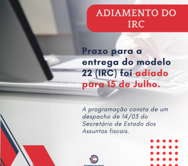 Este ano, a entrega da declaração de IRC e o respetivo pagamento referente ao ano de 2023, podem ser efetuados até dia 15 de julho de 2024, segundo um despacho de 14 de março assinado pelo Secretário de Estado dos Assuntos Fiscais (SEAF).